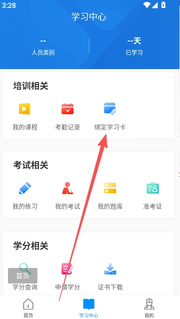 1、打开本站软件资源的安装包,进入后点击学习中心版块,找到并选择绑定学习卡的服务功能选项。