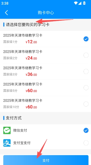 3、选择你要购买的学习卡类型下单支付,以支付宝或是微信的方式完成。