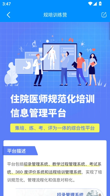 医博士是一款面向医学工作者打造的教学管理软件,涵盖规范化培训、继续医学教育、执业资格考试辅导等多维度教育服务,采用线上线下融合的模式适配不同学习场景,助力用户快速增强专业素养。