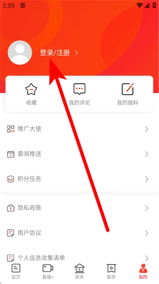 2、在个人页面,点击登录注册,进入登录页面。