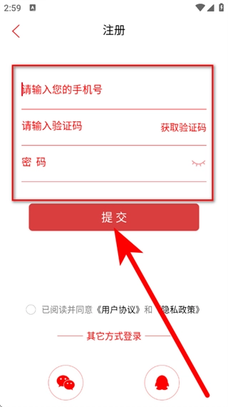 4、输入手机号、验证码及密码后,点击提交,完成注册。