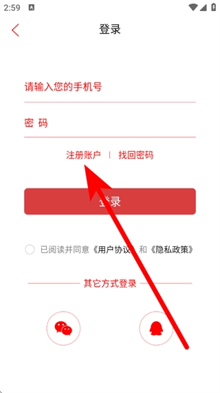 3、在登录页面,点击注册账户,进入注册页面。