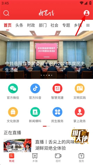 在新巴陵首页,点击右上角的头像图标,即可进入个人中心页面。