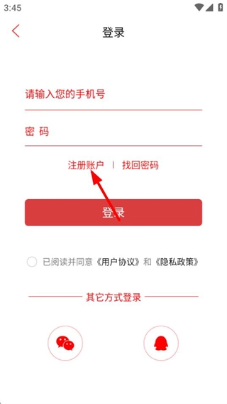 3、在登录页面,点击注册账户选项,进入注册页面。