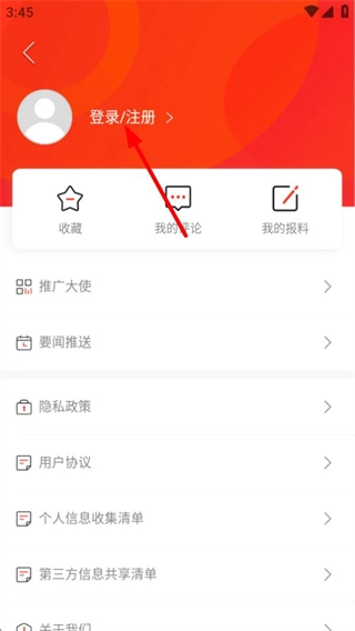 2、在个人中心页面,点击登录注册选项,进入登录页面。