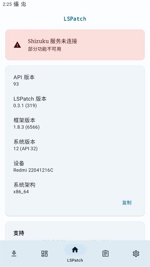 1、在lspatch模块列表里,长按任意一个模块,然后选择支持选项,同时处理框架和管理器的支持相关问题。