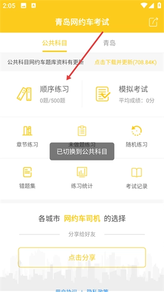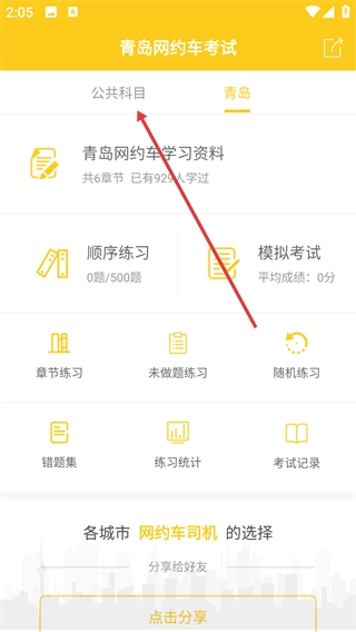 1、打开【青岛网约车考试】应用,点击顶部的【公共科目】标签,即可切换到对应的练习板块。