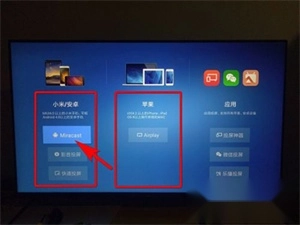 2、然后我们进入设置选择界面,我们可以看到有两种无线连接功能,一种是安卓/小米的Micracast无线连接,还有一个是苹果手机的Airplay功能,这里我们选择头一个安卓手机的Micracast连接。