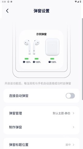 连接后手机页面自动弹出弹框,方便用户查看电量和功能设置。