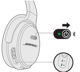 对于大多数Bose蓝牙耳机,将电源/蓝牙按钮滑至右侧并按住几秒钟,直到听到“准备连接另一台设备”或蓝牙指示灯闪烁蓝色光。