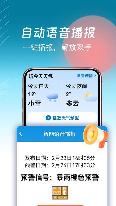 【语音播报】不想看天气?点击语音播报,读给你听,今日温度、天气预警、穿衣建议、空气质量、未来天气,想听什么,应有尽有;