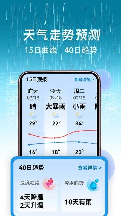 【40日天气】超长40天逐日天气预报,未来天气早知道,早准备。同时40日天气结合日历功能更加清晰,节日节气天气如何,一目了然。