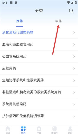 1、打开用药参考,进入【分类】页面,点击【中药】标签来切换分类。