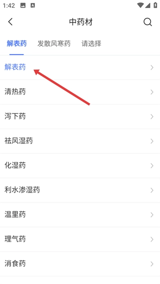 3、进入中药材页后,选择【解表药】分类查看对应药材哦。
