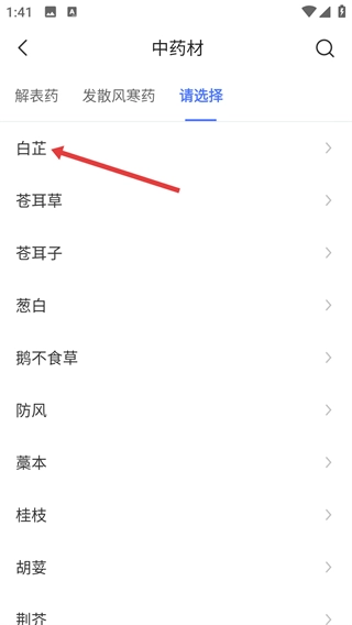 4、在解表药分类下,点击【白芷】即可查看该药材详情啦,以此类推学中医相关知识哦。