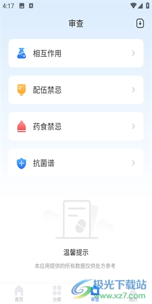 3、在审查可以查看相互作用、配伍禁忌、药食禁忌、抗菌谱等等。