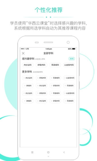学员使用"华西云课堂"时选择感兴趣的学科,系统根据所选学科自动为其推荐课程内容。