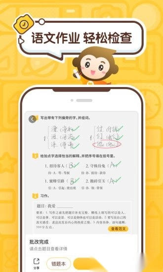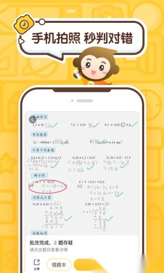1. 拍照检查,秒判对错:只需对作业拍照,一秒就能帮您判断对错,并进行针对性的分析辅导,让孩子“知错能改”;