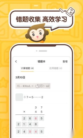 7. 错题收集,针对练习:自动收集错题,让孩子更有针对性的练习,重点学习数学难点、易错点;