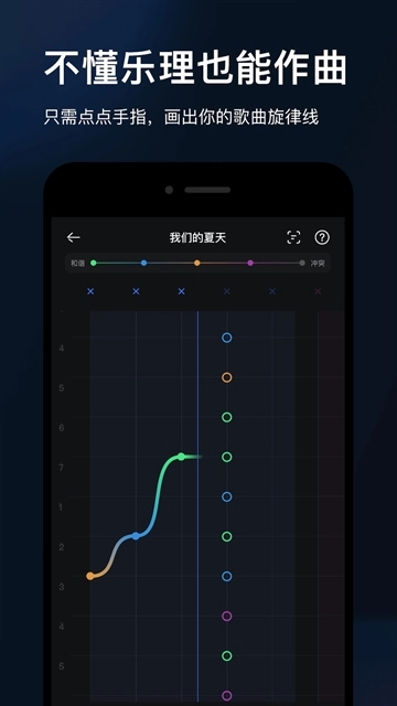 画音作曲是一种结合标准作曲法的全新作曲形式,无需乐理知识,只要你的音乐感觉好,就可以用手指点音连线的方式完成旋律创作。用彩色的音符表达情感,一起来体验作曲的快乐吧!