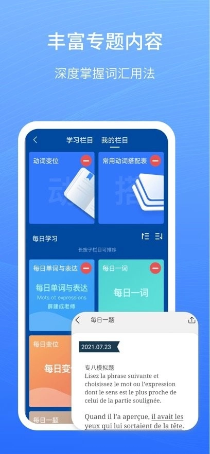 涵盖每日一词、每日一题(专四/专八模拟题)、每日变位、每日单词与表达五大学习任务,每天智能推荐学习内容,打开软件就能学习新知识。