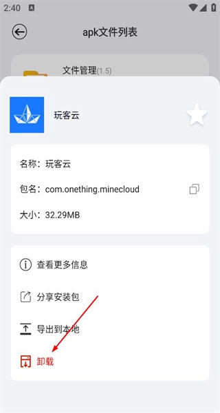 2、在apk文件列表页面,浏览展示的应用条目,找到玩客云应用并点击,调出该应用的操作功能菜单。