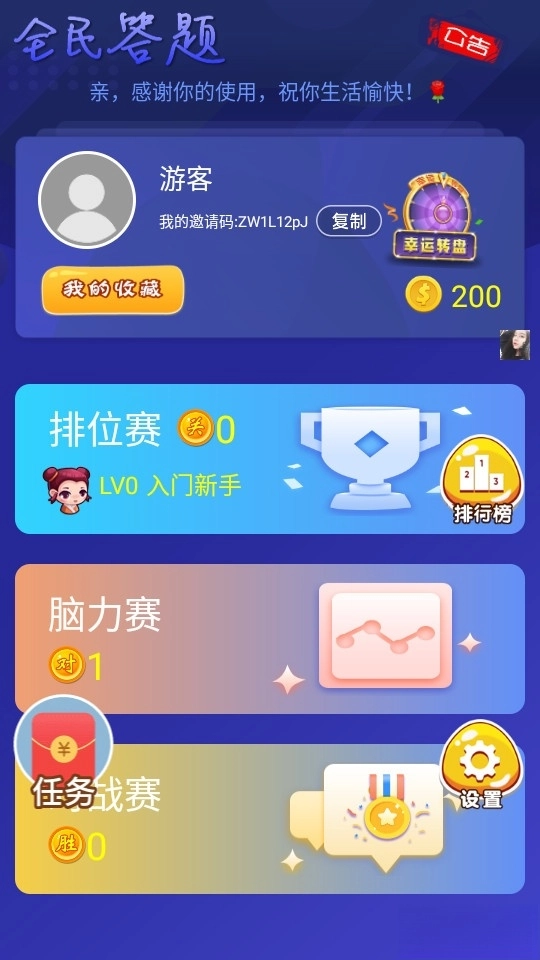 进入软件主页后,大家能根据个人喜好挑选三种不同的游戏玩法。排位赛涵盖的答题知识范围很广,刚接触的用户可以先通过点击脑力赛来熟悉答题题目。