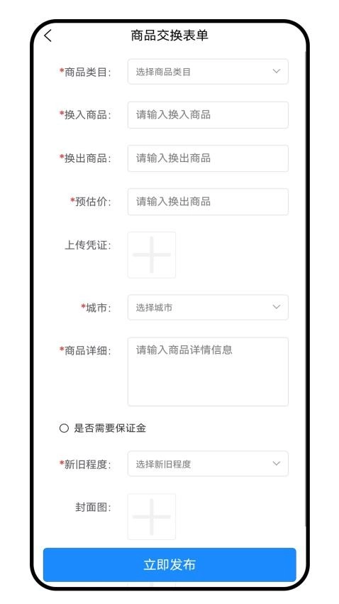 1、用户能够迅速发布闲置物品并填写交换表单,智能系统会自动生成包含图文详情的交易卡。
