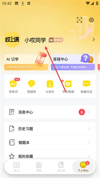 2、进入【个人中心】页面后,点击【小哎同学】所在区域,能进入【个人资料】界面。