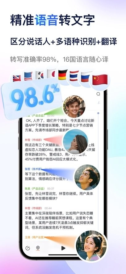 1、 一键开启录音,同步实现录音转文字与多国语言翻译功能:录音实时转文字环节,准确率可达98%,能识别48种语言及方言,无论说何种语言都能精准理解;多语种实时翻译则高效且精准,支持16国语言之间的自由互译,有了它,再也不用担心不懂外语的问题了。