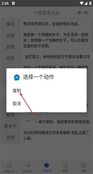 4、在弹出的选择一个动作弹窗里点击复制选项,即可将选中的个性签名复制到剪贴板。