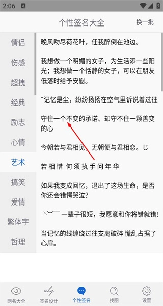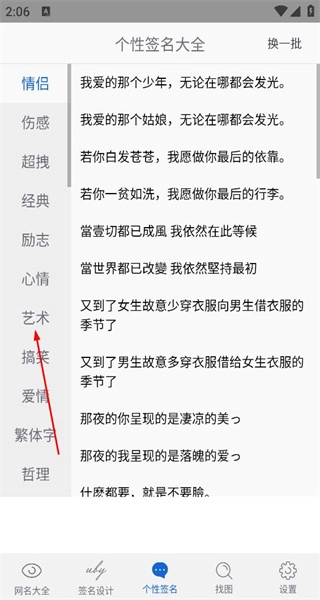 2、在个性签名大全页,选择艺术分类,查看该分类下的签名内容,挑选心仪的签名文本。