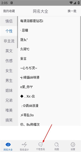 打开软件进入首页后,浏览各类网名,接着点击个性签名选项,即可进入个性签名大全页面。