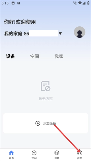进入软件界面后,能看到【我的家庭-86】,底部设有【我的】按钮,在当前的【设备】标签页下,可借助【添加设备】功能来新增设备。