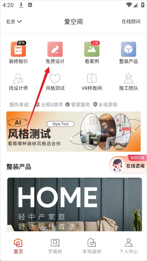 1、打开爱空间装修App,在首页找到并点击【免费设计】入口;
