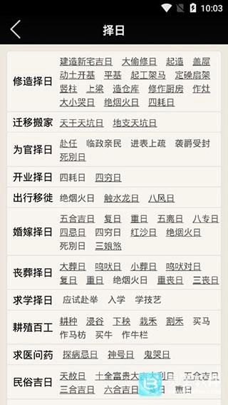 4、择日宜忌:结婚、婚嫁、约会、开业、开张、开市、动土、开光、搬家时,建议挑选一个黄道吉日。