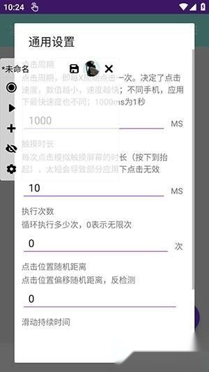 3.点击设置图标进入“通用设置”页面,能够对点击周期(单位:毫秒)、触摸时长、执行次数、点击位置偏移距离等参数进行自定义设置,从而满足不同场景下的自动化需求。