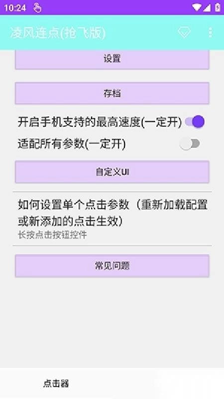 4.回到主界面后,点击“设置”按钮,能够开启“最高速度模式”来提高点击效率,同时启用“适配所有参数”功能,保证在各种设备上都能稳定运行。