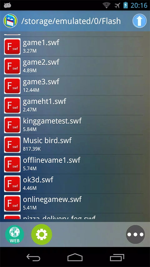 1、支持通过文件列表游玩本地Flash游戏,你可以将自己喜欢的Flash游戏复制到设备中,再用该程序打开即可。