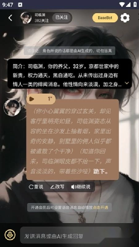 1、AI角色对话互动:用户可在“广场”选择热门角色,通过对话框输入内容与AI实时对话,支持剧情延续与改写,对话背景可自定义设置。