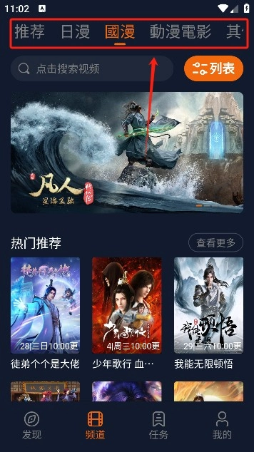 2、点击顶部的栏目即可快速对动漫类型进行切换