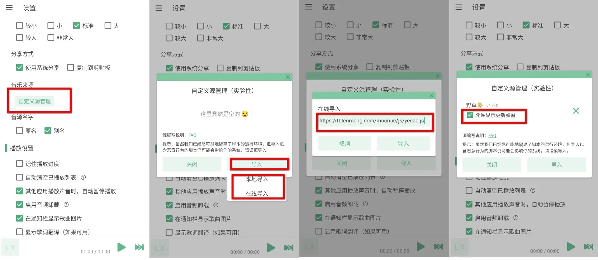 【设置】→【导入】→【在线导入】/【本地导入】→输入音乐地址→全选导入的音源