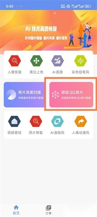 1、打开照片恢复大师App,点击“深度查找微信QQ照片数据”选项。