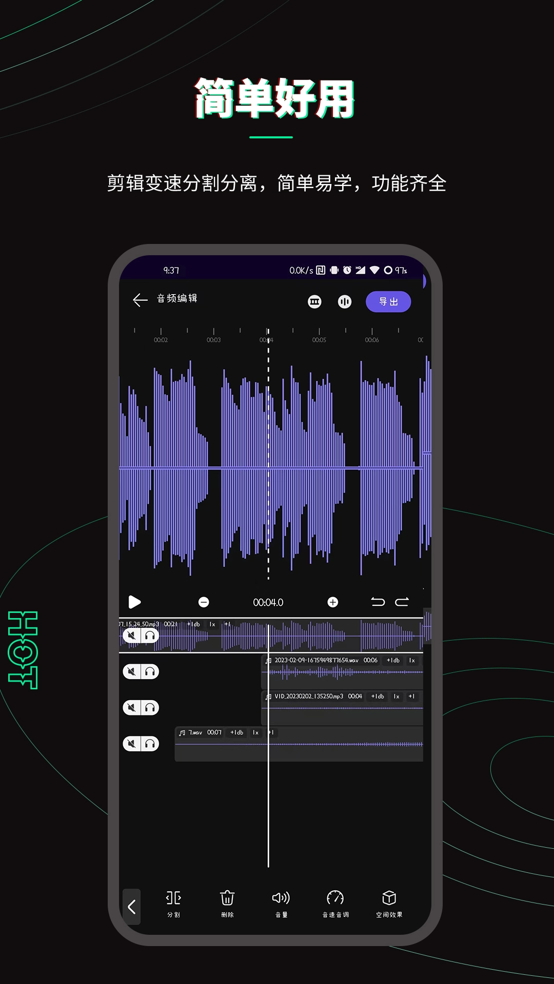 7、导出音频:完成编辑后,选择导出的格式与质量参数,点击“导出”按钮,即可将音频保存至设备或进行分享。