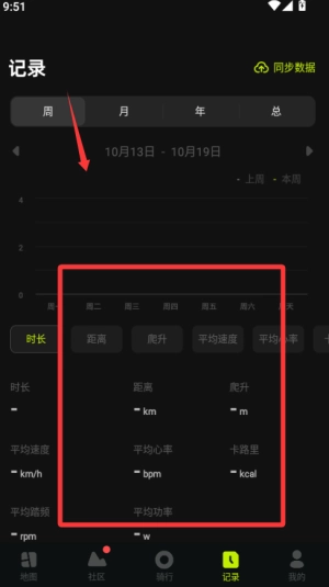 3、查看骑行数据时,进入历史记录查看每次的里程和爬升高度,支持查看详细的速度曲线图。