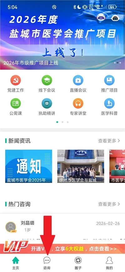 1、打开"健康盐城"进入首页,在底部导航栏中点击"咨询"进入该页面;
