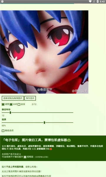 1、安装完成后点击“选择或粘贴拖曳图片”按钮选择需要做旧添加电子包浆的图片。2、之后在下方选择绿图、水印等做旧手段,再在下面选择做旧的年份和画质就可以轻松完成图片做旧处理了。3、制作好图片之后点击“保存图片”按钮就可以将做旧完的图片保存下来了。
