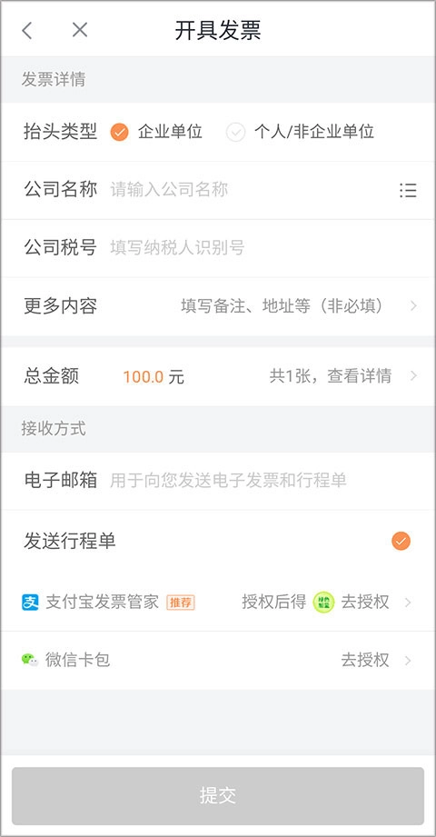4、最后选择要开发票的订单,填写好【发票抬头】和【电子邮箱地址】,点击下方提交按钮即可。
