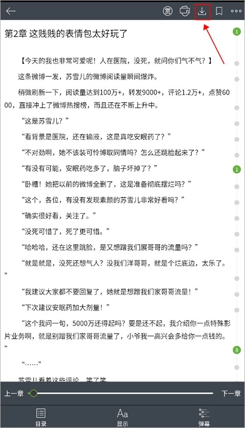 1、在小说阅读页面点击屏幕调出功能栏后,点击“↓”形状的图标