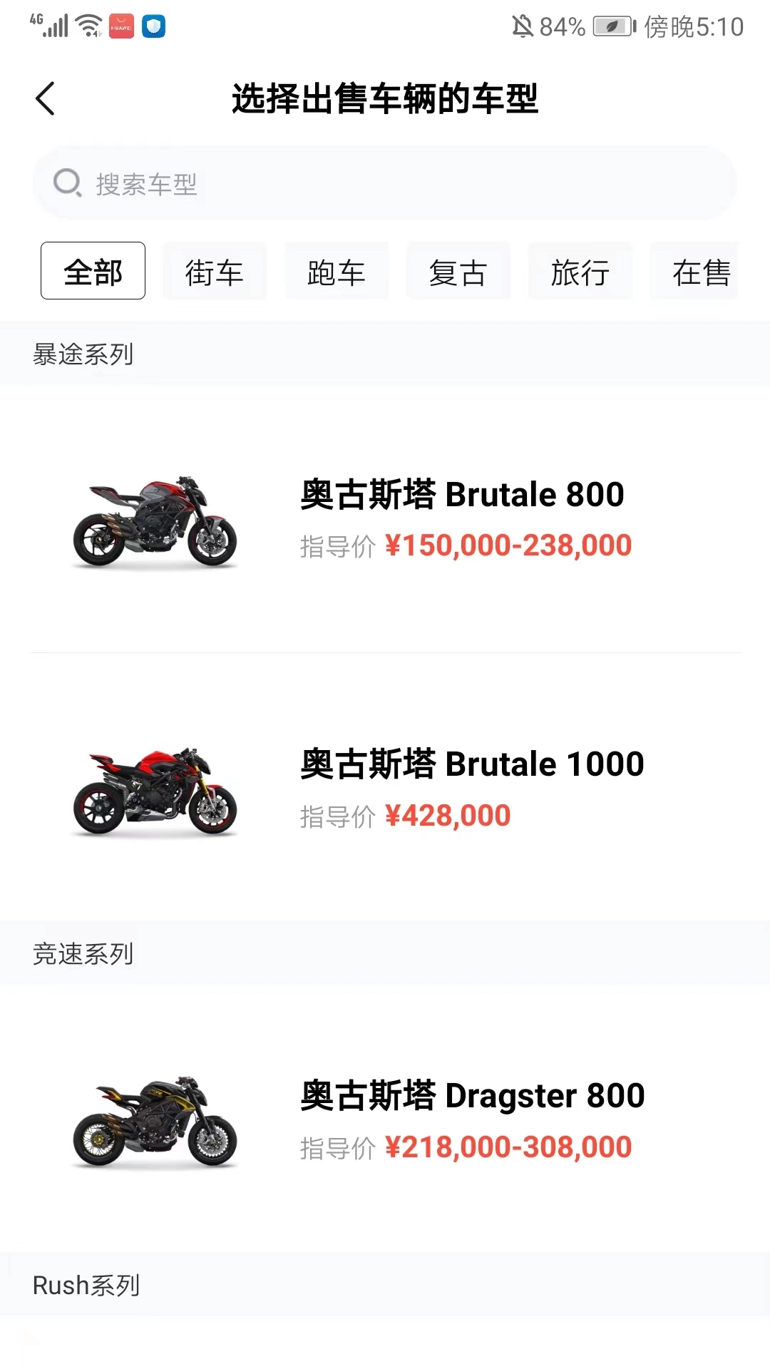 4、选择出售车辆的车型,包括街车、跑车、复古、旅行、在售等分类,也可以进行搜索,